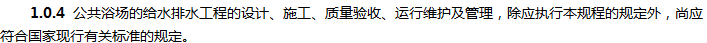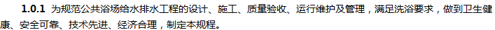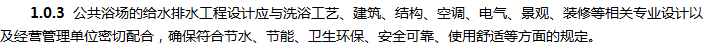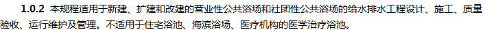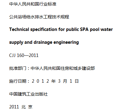 本规程的主要技术内容是:1.总则;2.术语和符号;3.洗浴水质、水温;4.浴池给水系统;5.淋浴设计;6.浴池设计;7.浴池水消毒与水质平衡;8.洗浴水加热;9.设备和管材;10.废水及余热利用;11.设备机房:12.施工及质量验收;13.运行与管理;相关附录