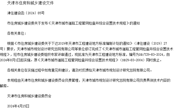 天津市城市道路工程管网检查井综合设置技术规程收藏