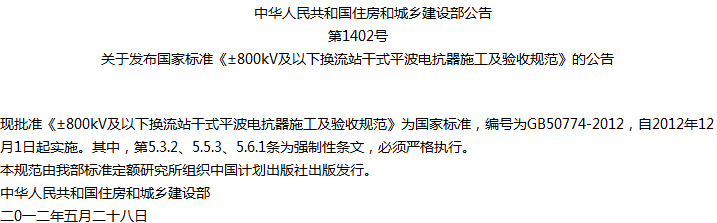 ±800kV及以下换流站干式平波电抗器施工及验收规范收藏