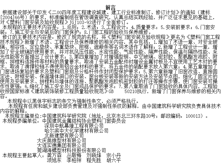 现批准《塑料门窗工程技术规程》为行业标准,编号为JG 103-2008,自2008年11月1日起实施。其中,第3.1.2、6.2.8、6.2.19、6.2.23、7.1.2条为强制性条文,必须严格执行。原行业标准《塑料门窗安装及验收规程》JGJ 103-96同时废止。