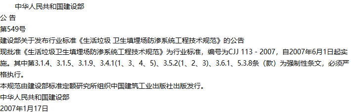 生活垃圾卫生填埋场防渗系统工程技术规范收藏
