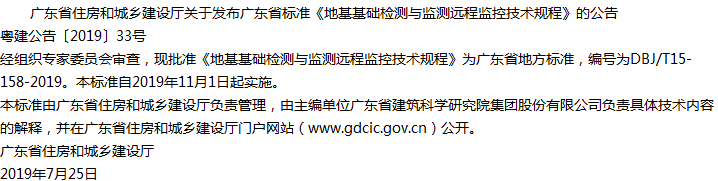 根据《广东省住房和城乡建设厅关于发布<2012年广东省工程建设标准制订和修订计划>的通知》(粤建科函〔2012〕797号)的要求,广东省建筑科学研究院集团股份有限公司会同有关单位经过广泛调查研究,认真总结建筑地基基础检测与监测远程监控的实践经验和科研成果,参考有关国内外先进标准,并在广泛征求意见的基础上,编制了《地基基础检测与监测远程监控技术规程》。